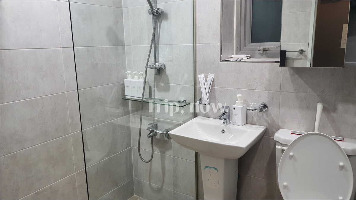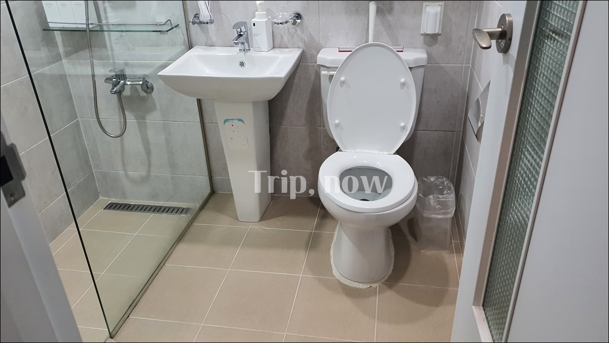 샤워하는 곳이 따로 분리되어 있어 물이 밖으로 새어 나갈 일은 없지만, 화장실에 문턱이 없는 것이 조금 불안하기는 했다.