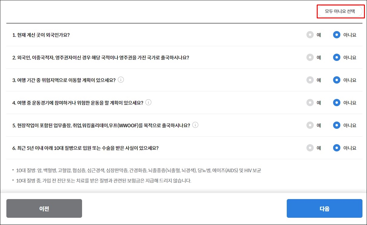 6개 문항에 전부 '아니요'를 체크해야 한다면 상단에 있는 [모두 아니요 선택]을 눌러 쉽게 처리할 수 있습니다.