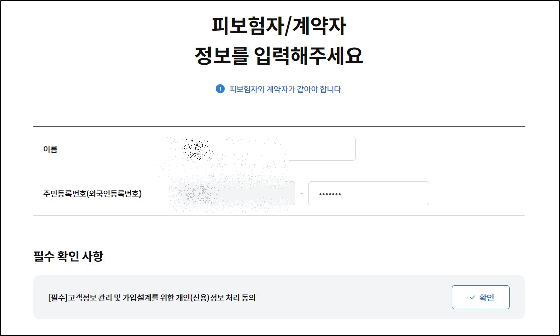 6. 피보험자/계약자 정보를 입력 후 필수 확인 사항 [확인 체크] 후 '다음'을 눌러주세요.