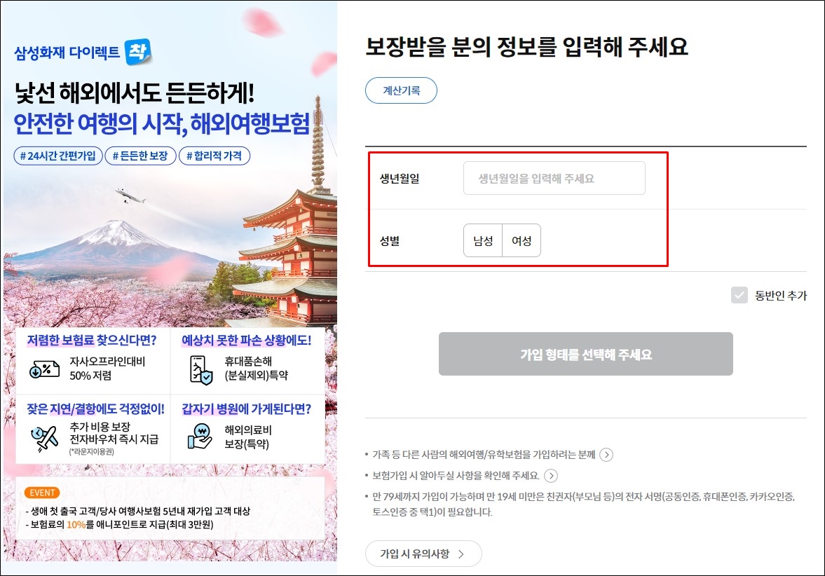 1. 삼성화재 여행자보험 가입의 첫 단계는 생년월일 입력과 성별 선택입니다.