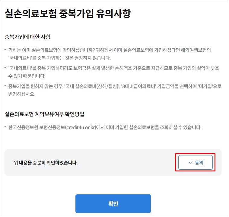 4. 실손의료보험 중복가입 유의사항에 [동의] 체크 후 '확인'을 눌러주세요.