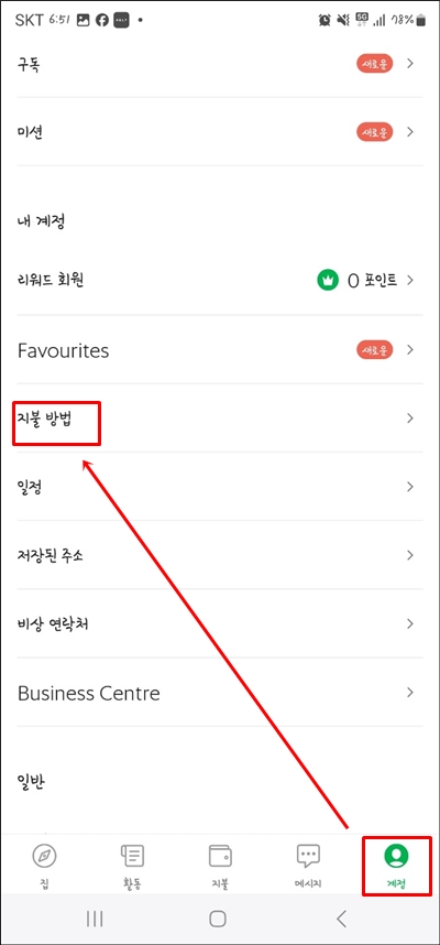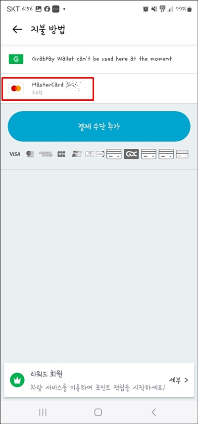 7. 카드 등록이 정상적으로 완료되면 지불 방법에서 등록한 신용카드가 조회됩니다.
