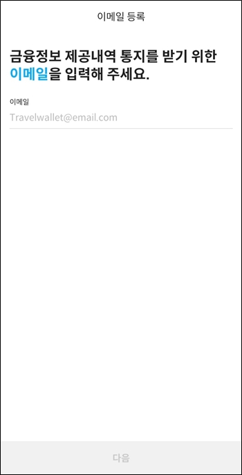 5. 금융정보 제공내역 통지를 받기 위한 이메일 입력 ▶ 계좌 인증 ▶ 트래블월렛 비밀번호 6자리를 설정합니다.