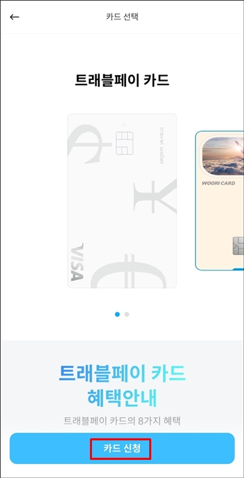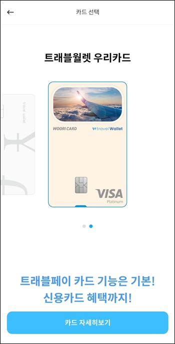 저는 계좌연결을 우리은행으로 해서 그런지 트래블페이 카드와 트래블월렛 우리 카드 중 선택이 가능했습니다.