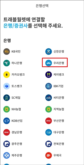 3. 트래블월렛에 연결할 은행이나 증권사 계좌를 선택 후 계좌번호를 입력해주세요.