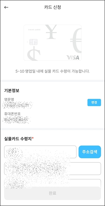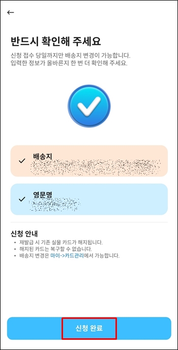 9. 카드 기본정보가 맞는지 재확인 후 실물카드 수령지를 입력 → '완료'를 눌러주세요.