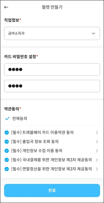 7. 직업정보, 카드 비밀번호, 약관동의 후 '완료'를 눌러주세요.