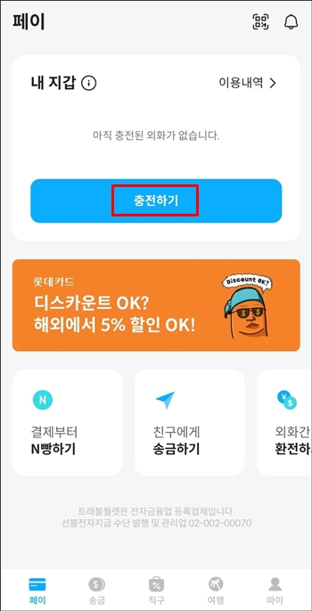 페이 ▶ 충전하기를 누르면 충전이 가능하며, 46개국 통화 중 선택하여 충전 가능합니다.