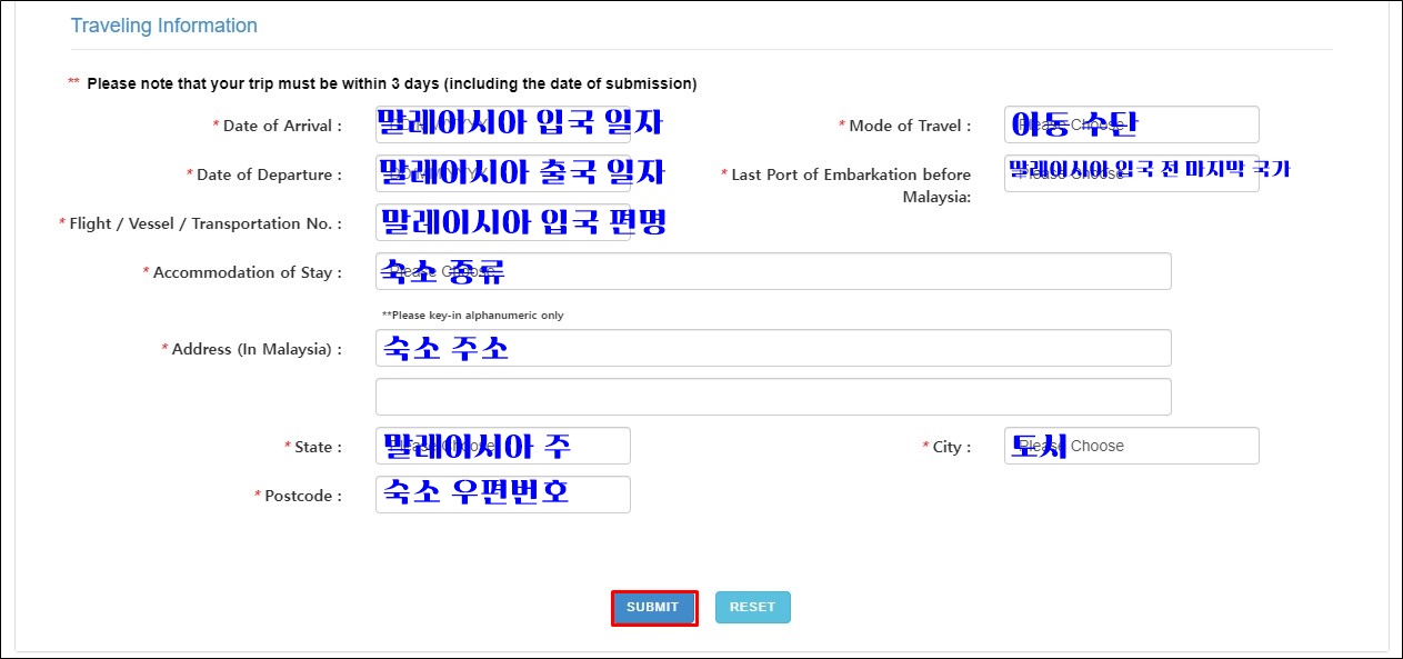 ● 말레이시아 입국 일자. 출국 일자. 입국 편명. 이동수단 : 항공권 예매내역 참고하여 기재