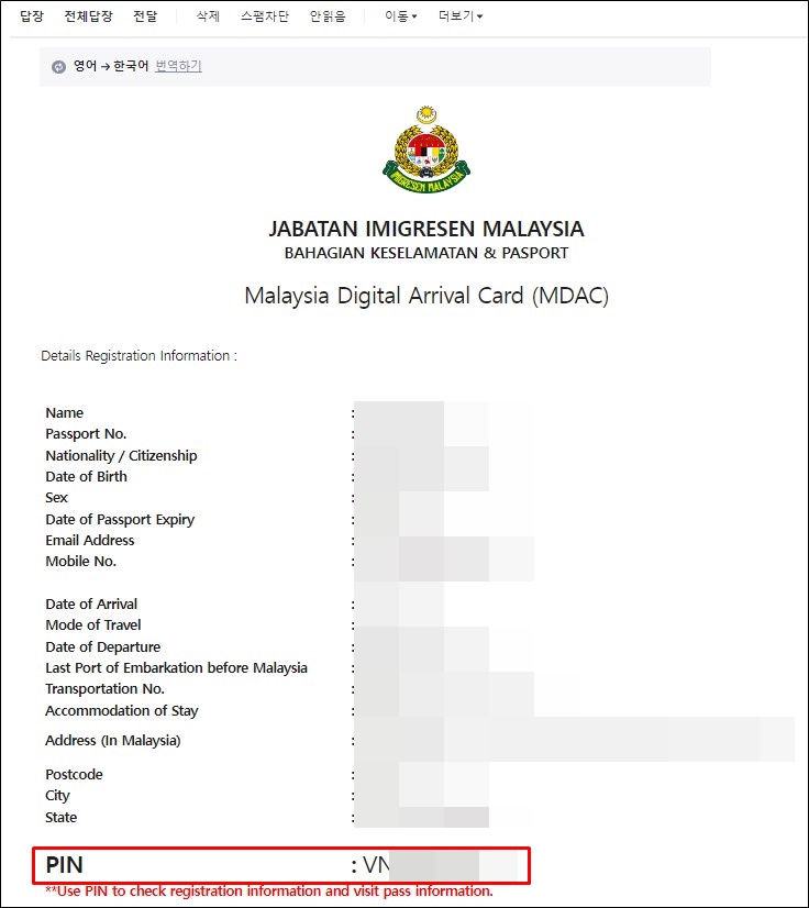 말레이시아 디지털 입국카드(MDAC)에는 입력한 정보 및 PIN번호가 기재되어 있습니다.