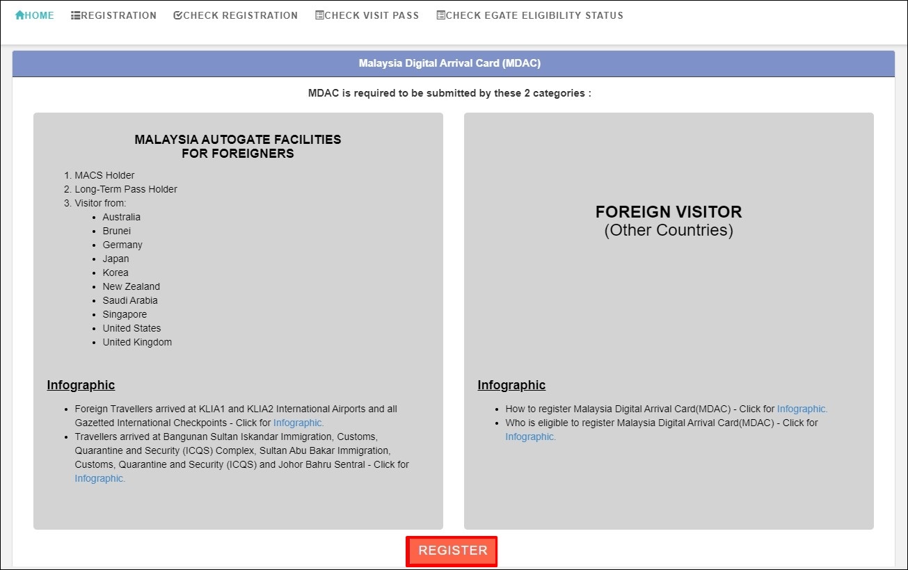1. 말레이시아 디지털 입국카드(입국신고서) 작성 사이트 접속 후 REGISTER(등록하다)를 눌러주세요.